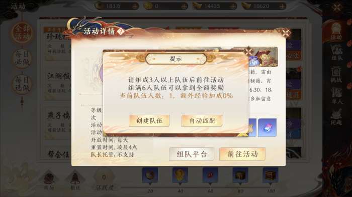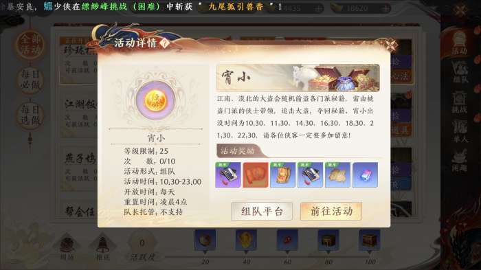 少侠可以点击【活动】-【宵小】-【前往活动】,进行组队参与。