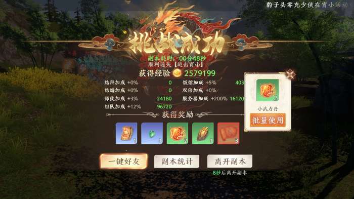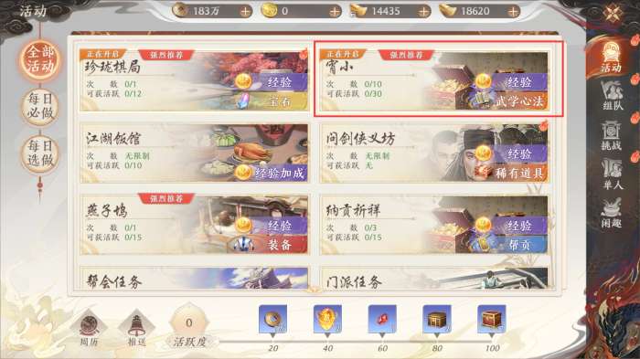少侠可以在【活动】-【宵小】进行参与,主要获得【经验】与【武学心法】等。