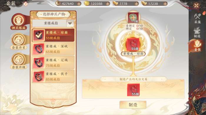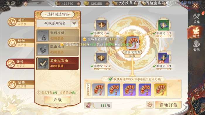 少侠可以在【生活】-【套装】对套装进行升级/升星。