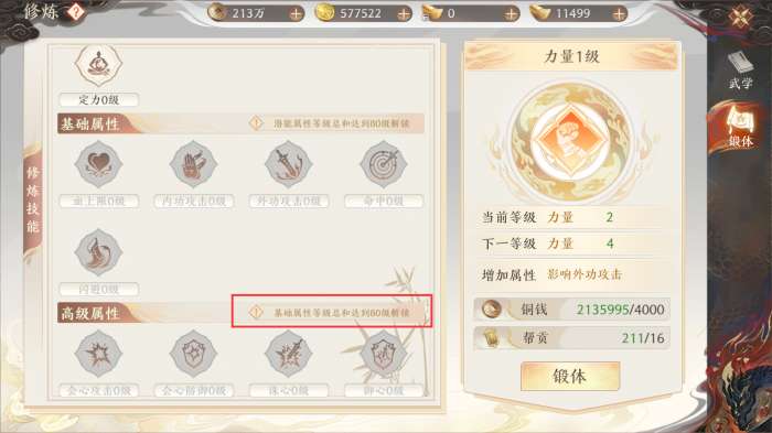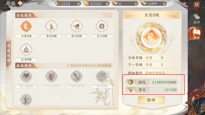 少侠可以通过【菜单】-【武学】-【锻体】进入锻体界面。