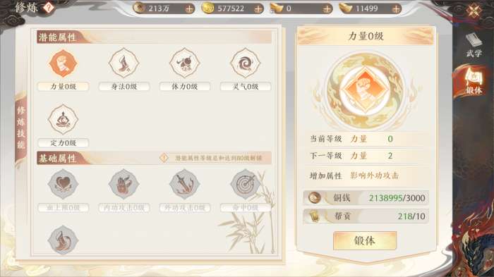 锻体分为【潜能属性】【基础属性】【高级属性】
