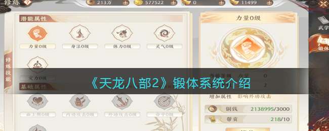 今天给大家带来了《天龙八部2》锻体系统介绍,通过【菜单】-【武学】-【锻体】进入锻体界面。锻体分为【潜能属性】【基础属性】【高级属性】,【基础属性】需要潜能属性等级总和达到80级解锁。每一次升级都需要消耗【帮贡】与【铜钱】。