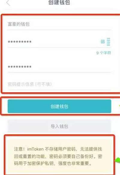3:然后我们输入对应的信息,名称,密码,确认密码,然后创建钱包,注意这里的提示我们一定要注意,一定一定要记住自己的密码;