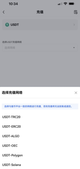 2、您可选择任意一个网络,但请留意,由于每个网络的性能各不相同,充值到账的速度、安全性、手续费等也将会有所区别。