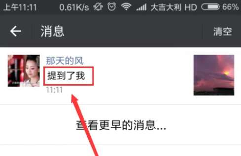 4、打开新消息,会显示朋友发送消息时提到了我,点击这条消息可以直达这条朋友圈,避免因为朋友圈消息太多而找不到朋友所发的消息。