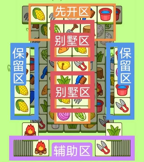 开局先消除橙色区的牌,这里有压牌。尽量要让牌面保持在同一水平面,然后一层一层消除表面牌,不要跨层太多拿牌,等表面牌消除完后,以大别墅内互相消除为主。