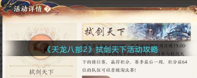 今天小编给大家带来了《天龙八部2》拭剑天下活动攻略,拭剑天下是跨服大型PVP活动,少侠需要以战队的形式参与比赛。少侠可以在【活动】-【拭剑天下】进入,或者点击【菜单】-【拭剑天下】参与。比赛分为排位赛和巅峰之战两个部分,四周为一个赛季,最后一周排位赛结束后进行巅峰之战淘汰赛。