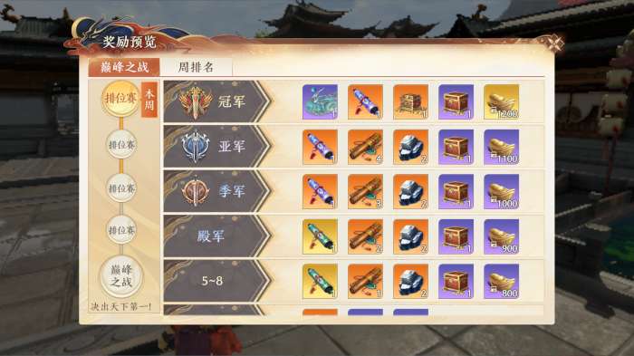 少侠可以在活动界面,点击【奖励预览】查看巅峰之战奖励与周排名奖励。