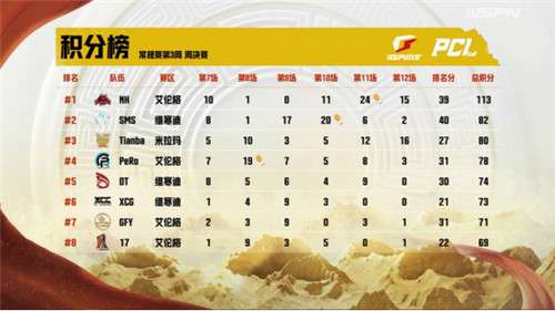 周决赛首日第三局六阶段,NH战队面对南部的混战,坐收渔翁之利,淘汰掉残编的DDT战队,随后的七阶段,NH战队在圈中心拉开枪线以合围之势淘汰KRG战队,拿到周决赛首鸡;第二日第五局八阶段,NH战队淘汰掉Tianba战队后进入决赛圈与DT战队SOLO。两支战队均是满编状态,但转瞬之间,NH战队展现默契配合以钳形攻势击倒DT战队三人,轻松拿下比赛。最终,NH战队以113分甩开第二名31分拿下本周周冠军!