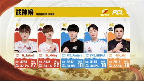 本周NH战队全员从开赛第一天就展现惊人的状态,并一直维持到周决赛:ZpYan1选手和MMing选手分别以4290、2935的惊人伤害值拿下一二名,特别是ZpYan1选手更是以27个淘汰数甩开其他选手获得本周战神的称号;XCG战队Pandora选手表现神勇,以18个淘汰数和3232的伤害值拿到战神榜第三;周亚军SMS战队功臣BBQFish选手则是以34.6%的得分贡献率位居第四;4AM战队的人气选手We1以2518的伤害值和18个淘汰数排在第五。