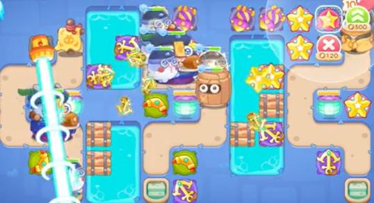 本关的主要难度在于有限的地图和萝卜位置的特殊性,这两个因素导致我们需要集中火力快速消灭怪物。关卡中道路较短,怪物出生点在右上角,我们需要尽快建立船锚炮台进行攻击,同时清理障碍物获取金币,在怪物到达萝卜前有足够的时间进行防御。