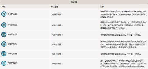 首先,米卡的命之座名为“星辰之印”,共有四个等级,每个等级都有其特殊的功能和价值。一级命座能够显著提升角色的输出能力,为玩家在战斗中提供更强大的火力支援。二级命座则进一步增强了角色的生存能力,使其在面对高强度战斗时更具韧性。三级和四级命座则分别提供了独特的辅助功能,如增加元素伤害,或是提升角色的元素反应效果,进一步提升了角色的战斗能力。