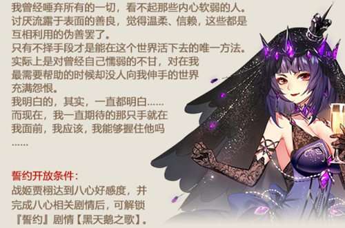 贾诩终于好感度达到八心了,完成八心相关剧情后,可解锁誓约剧情【黑天鹅之歌】。