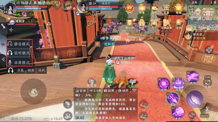 在组队界面可以设置【静音模式】、【收听模式】、【话筒模式】,实时语音等。