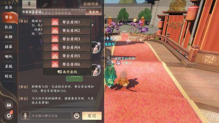 在帮会频道可以选择帮会房间收听语音,帮会管理可以修改语音规则。