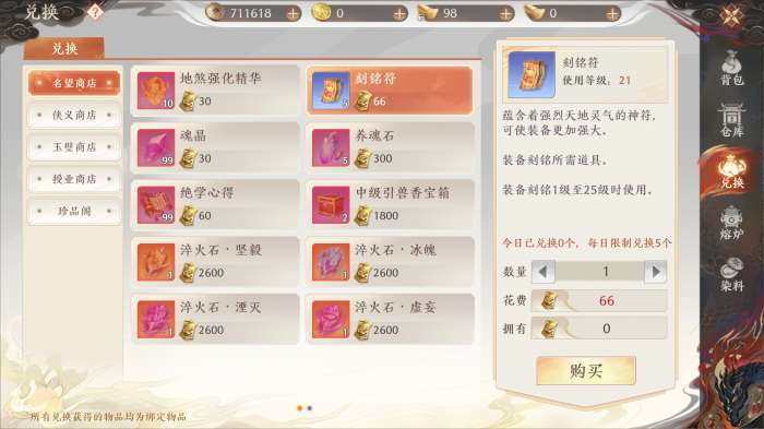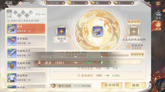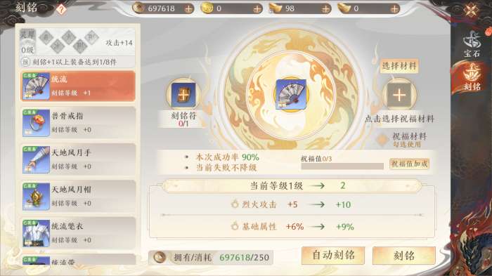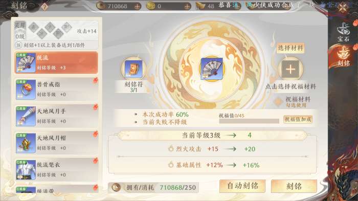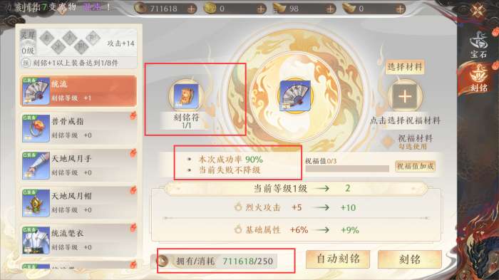 在「刻铭」时,需要消耗【刻铭符】与【铜钱】,因为前3级「刻铭」不会降级,所以前期「刻铭」不要使用【祝福材料】。