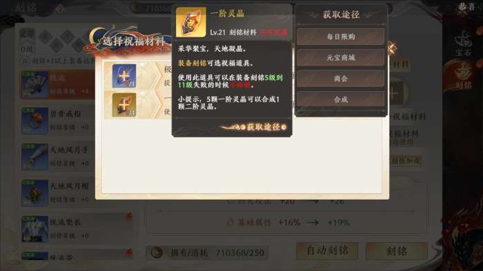 在高等级「刻铭」一定不要忘记使用祝福材料哦,同时因为极率晶玉不保级使用需谨慎,低等级可以高等级铭刻不推荐,主要推荐刻铭灵晶。