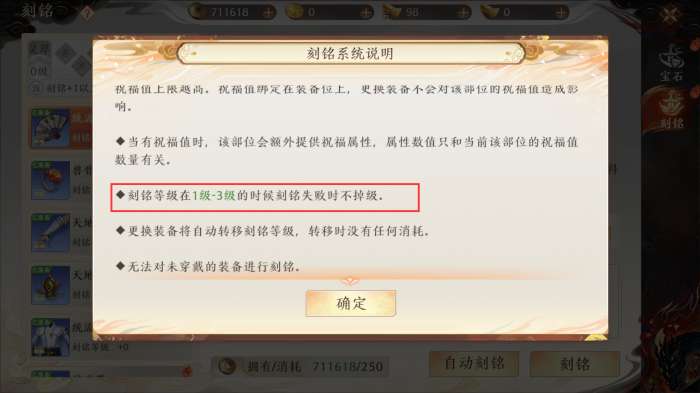 「刻铭」并不是百分百成功的,越高的「刻铭」等级失败率越高,在「刻铭」3级前,失败不会降级,所以少侠可以将所有的装备都「刻铭」3级后再追求更高的刻铭等级。