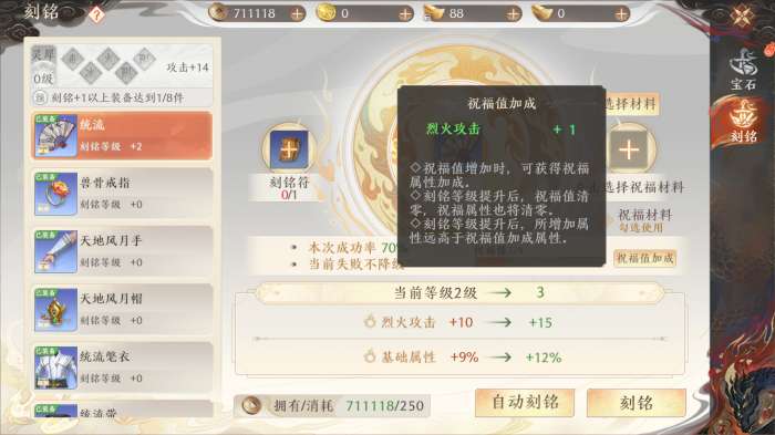 【祝福值】会提供一定的属性加成,「刻铭」等级提升后会清除。同时无法对没有穿戴的装备进行铭刻。