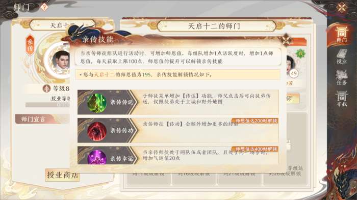 亲传技能:亲传师徒除了拥有普通师徒技能外,还额外拥有更加便利实用的亲传师徒技能。师恩值越高,解锁亲传技能越多。