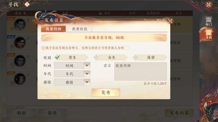 少侠除了可以与好友侠士结为师徒以外,还可以点击【我要拜师】/【我要收徒】,填写信息,在【寻找】中发布拜师/收徒邀请。