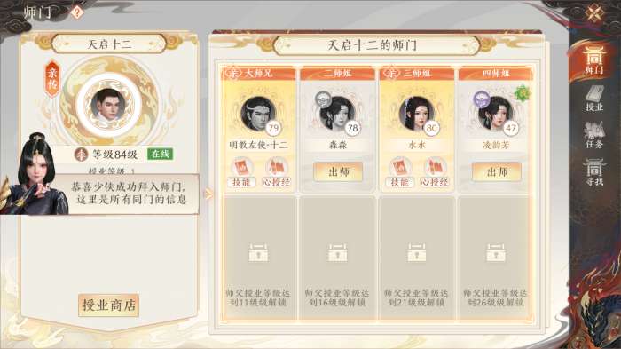 心授经:在师门界面中,可通过对方的交互列表,查看心授经。