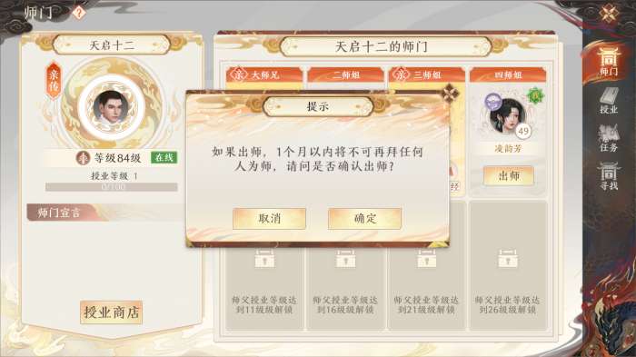 ◇ 89<服务器等级≤99,89级以上的少侠,可选择成为师父并进行收徒。等级达到达到89级,且传道进度达到600以上的少侠,可以选择出师。