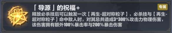 「导源」:开局首选。强力倍率刻印,每使用一次特殊攻击或大招会额外造成900%倍率的伤害,且该伤害百分百暴击和有200%暴伤加成。