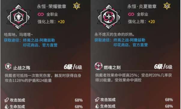 徽章方面,因海柔尔注重自身生存保命,使佩戴者免死一次的荣耀徽章与其非常契合,提高效果命中的炎夏徽章也是不错的选择。