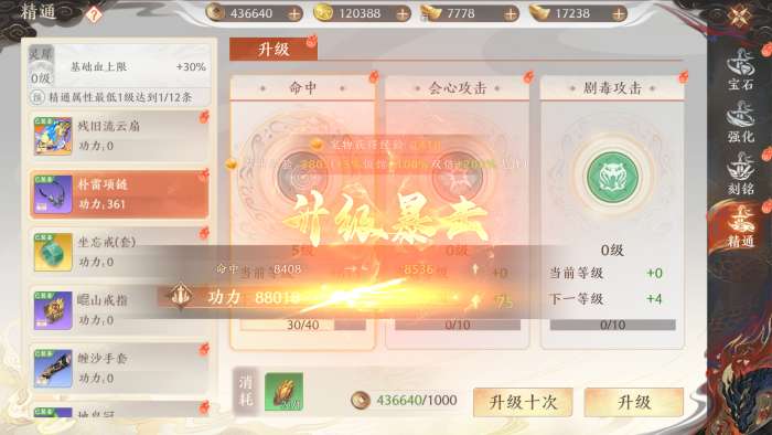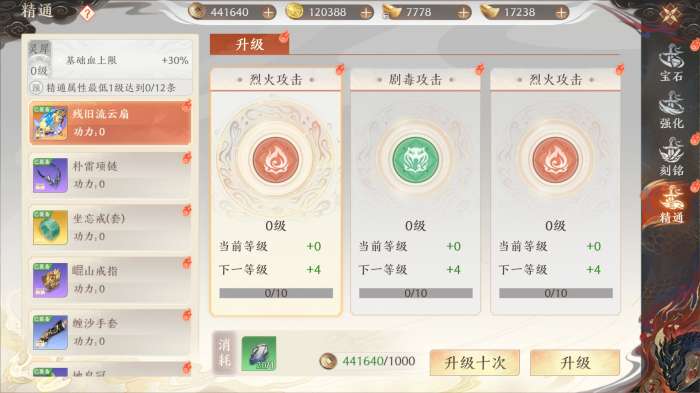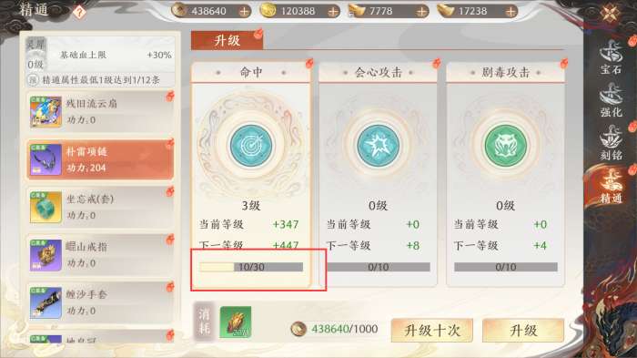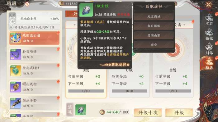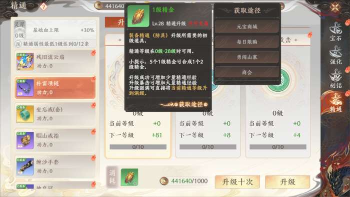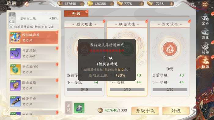 装备精通达到一定要求,会获得额外的【灵犀】加成,所以少侠前期精通可以保持同等级一起提升。