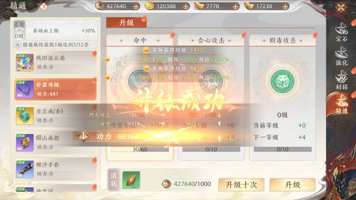少侠可以点击【菜单】-【强化】-【精通】打开装备精通界面,装备精通升级可以提升装备位上精通属性的属性值。