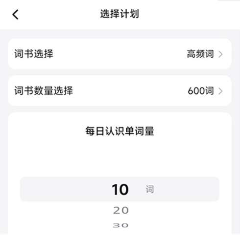 2、进入计划选择页面,选择每日认识单词,再点击词书选择;