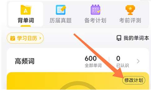 1、首先打开考试蚁,在背单词栏目,点击其中的修改计划;