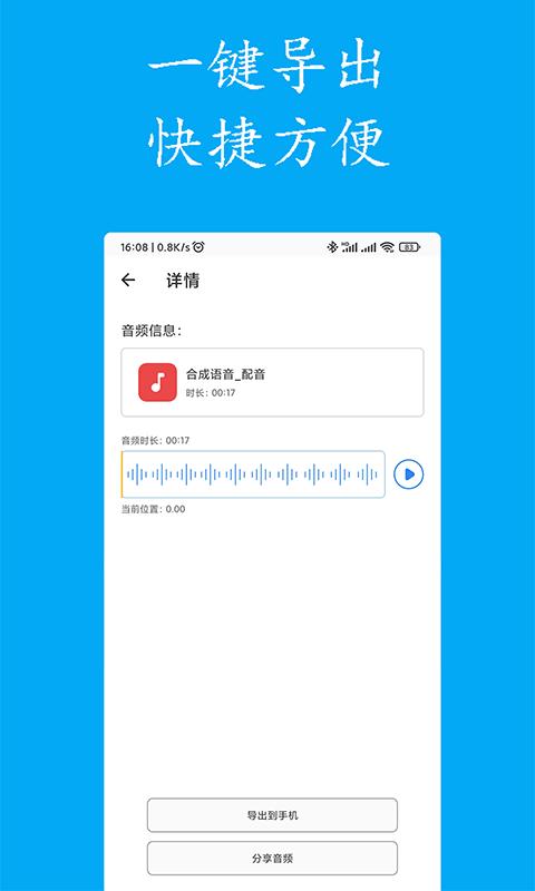 导出功能:可以将生成的音频保存到手机本地或导出为音频文件。