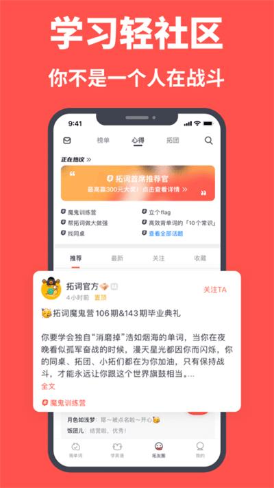 小编点评:拓词官方版是一款非常实用的英语学习应用,适合各类英语学习者使用。应用提供了丰富的学习资源和先进的学习工具,能够帮助您轻松提高词汇量,实现英语水平的突破。无论您是英语初学者还是进阶学习者,拓词官方版都能够为您提供优质的学习体验,是您提升英语水平的得力助手。强烈推荐给所有英语学习者使用!