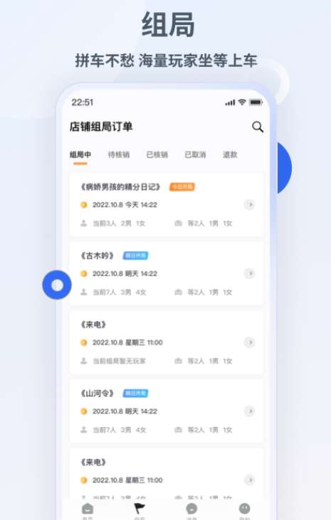 3、商家端自主发起店铺组局,波吉端同城组局、店铺组局等多种方式信息展示。